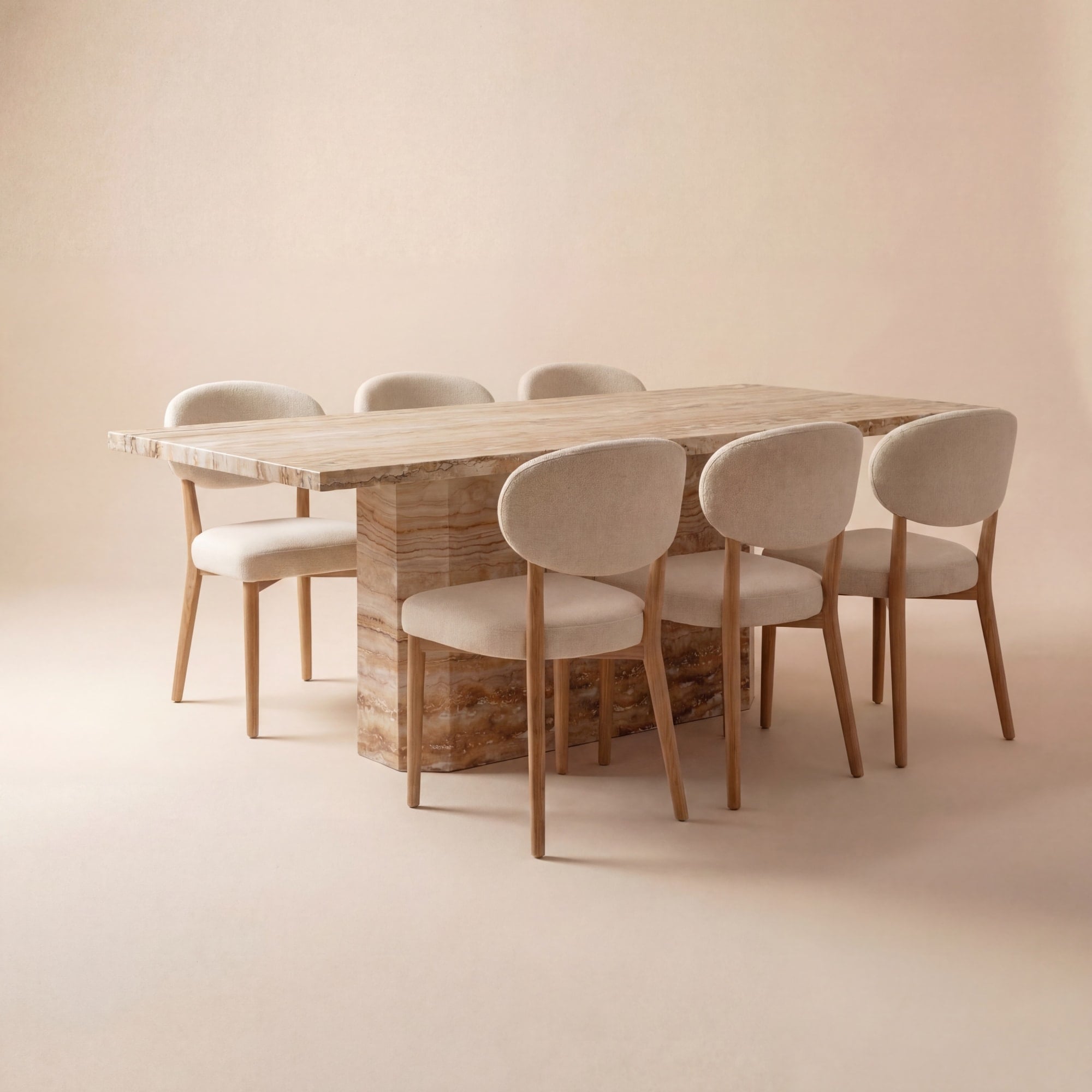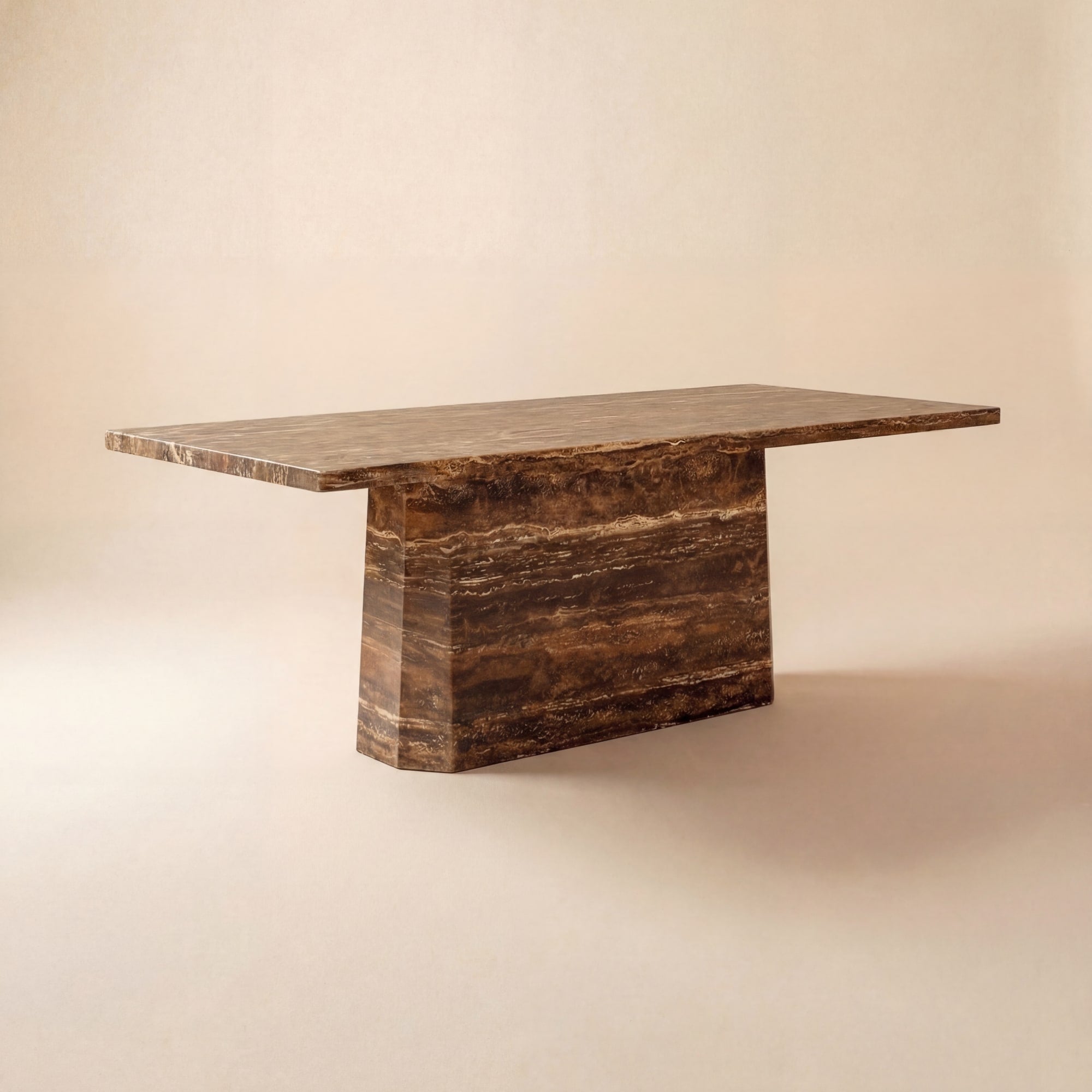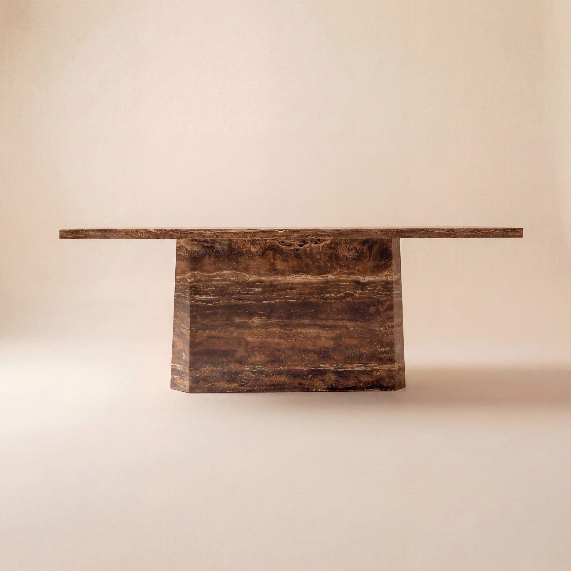 The Mensa is a table made to gather — a long, low form cut from a single slab of natural stone. Its clean rectangular surface invites long meals and longer conversations; its weighted pedestals root it to the room. Each Mensa is shaped by hand in Dubai, finished to reveal the stone's own veining and tone. A piece designed to become the quiet centre of a home.