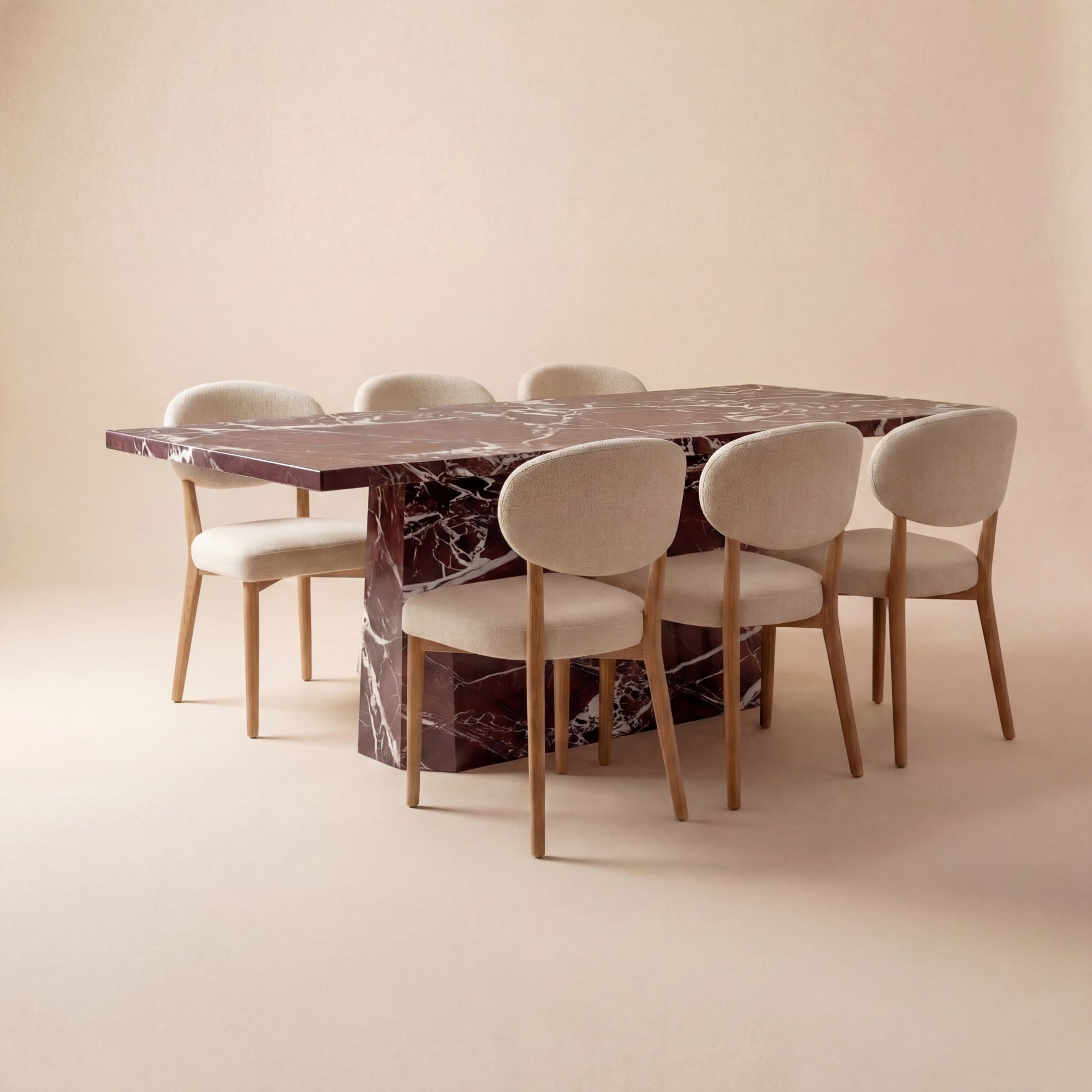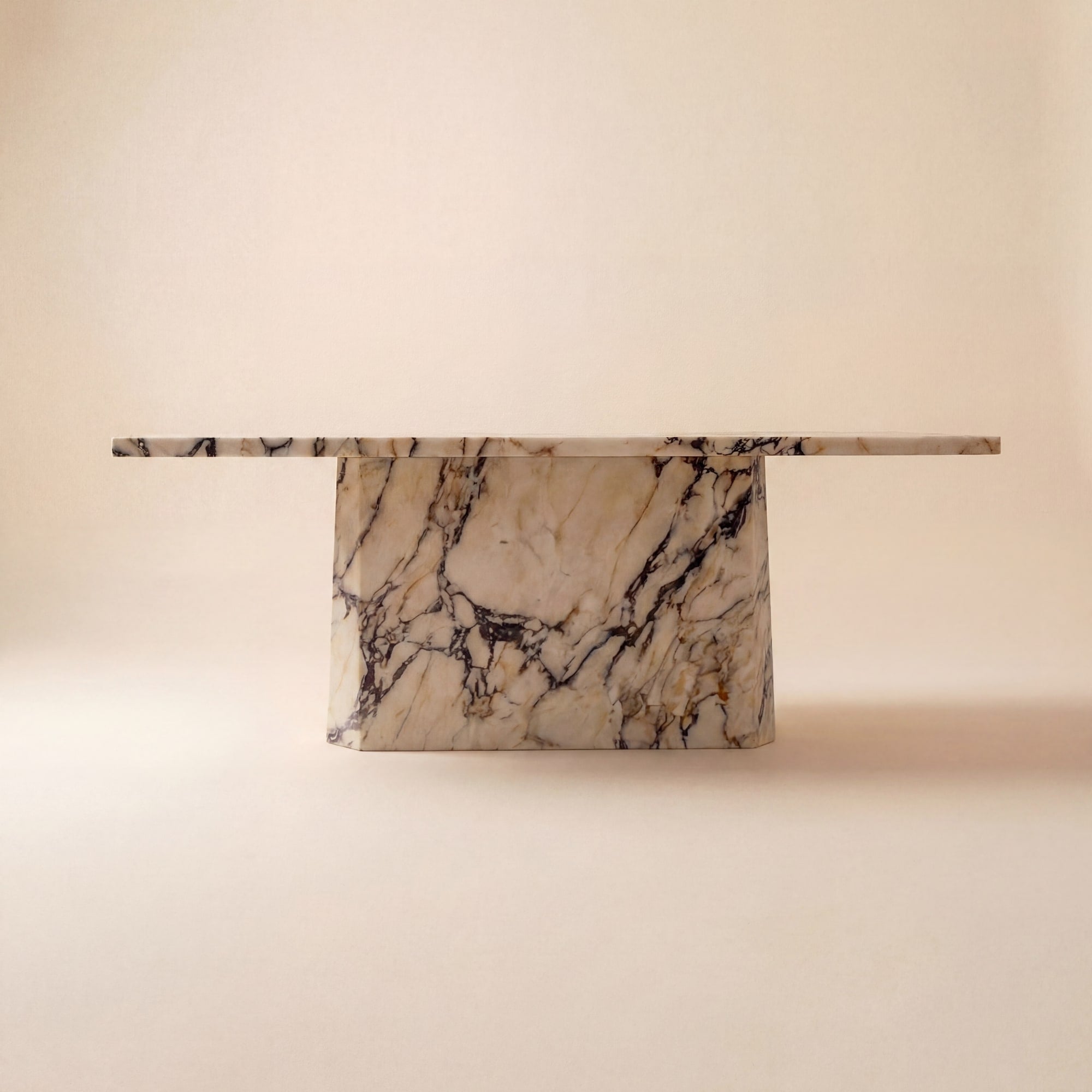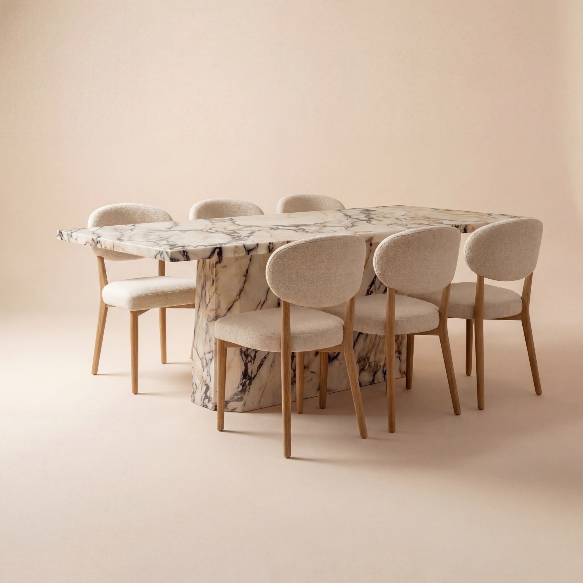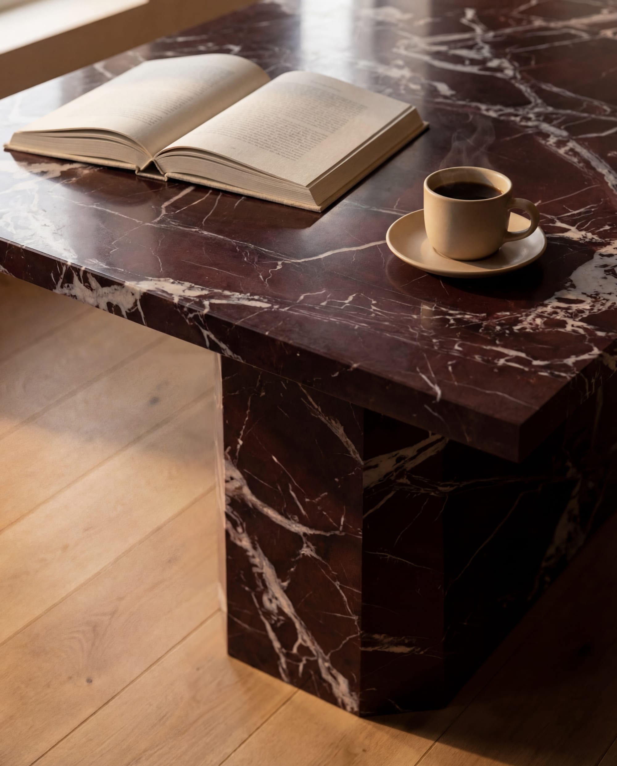 The Mensa is a table made to gather — a long, low form cut from a single slab of natural stone. Its clean rectangular surface invites long meals and longer conversations; its weighted pedestals root it to the room. Each Mensa is shaped by hand in Dubai, finished to reveal the stone's own veining and tone. A piece designed to become the quiet centre of a home.
