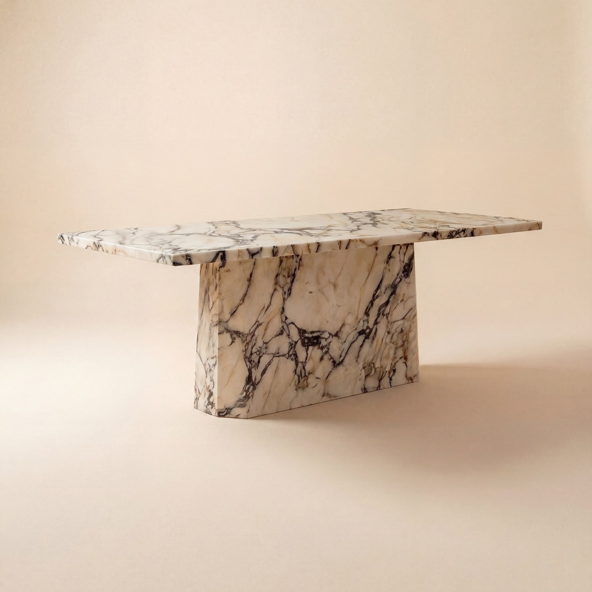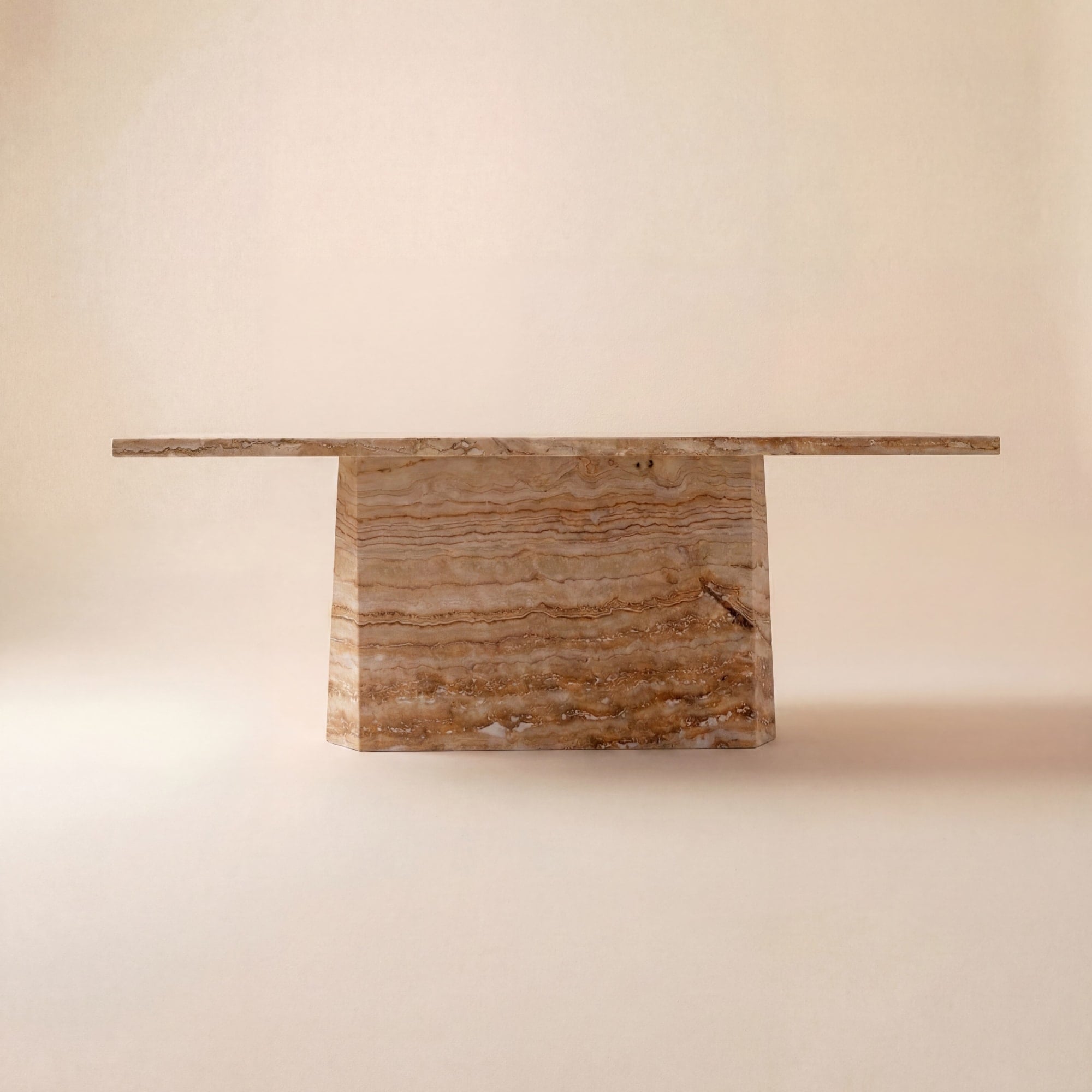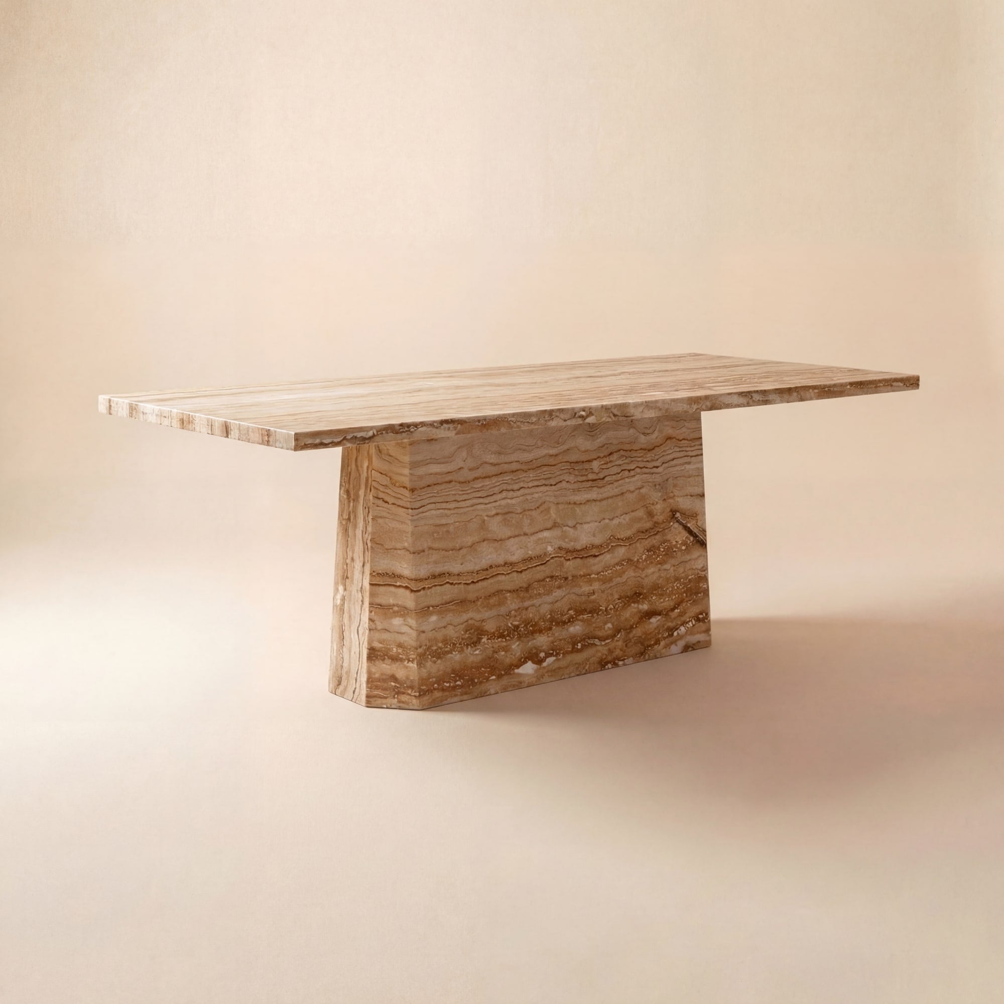 The Mensa is a table made to gather — a long, low form cut from a single slab of natural stone. Its clean rectangular surface invites long meals and longer conversations; its weighted pedestals root it to the room. Each Mensa is shaped by hand in Dubai, finished to reveal the stone's own veining and tone. A piece designed to become the quiet centre of a home.