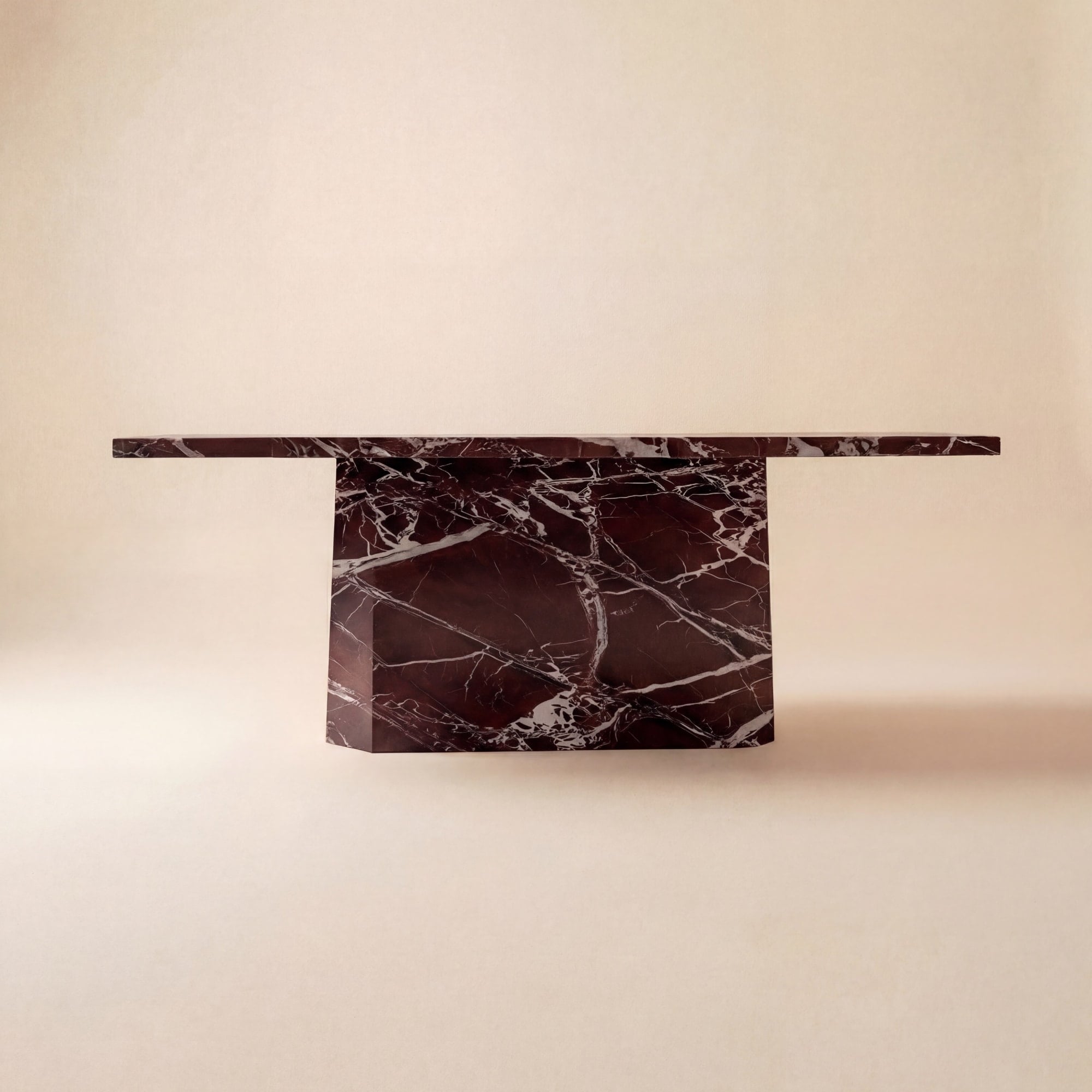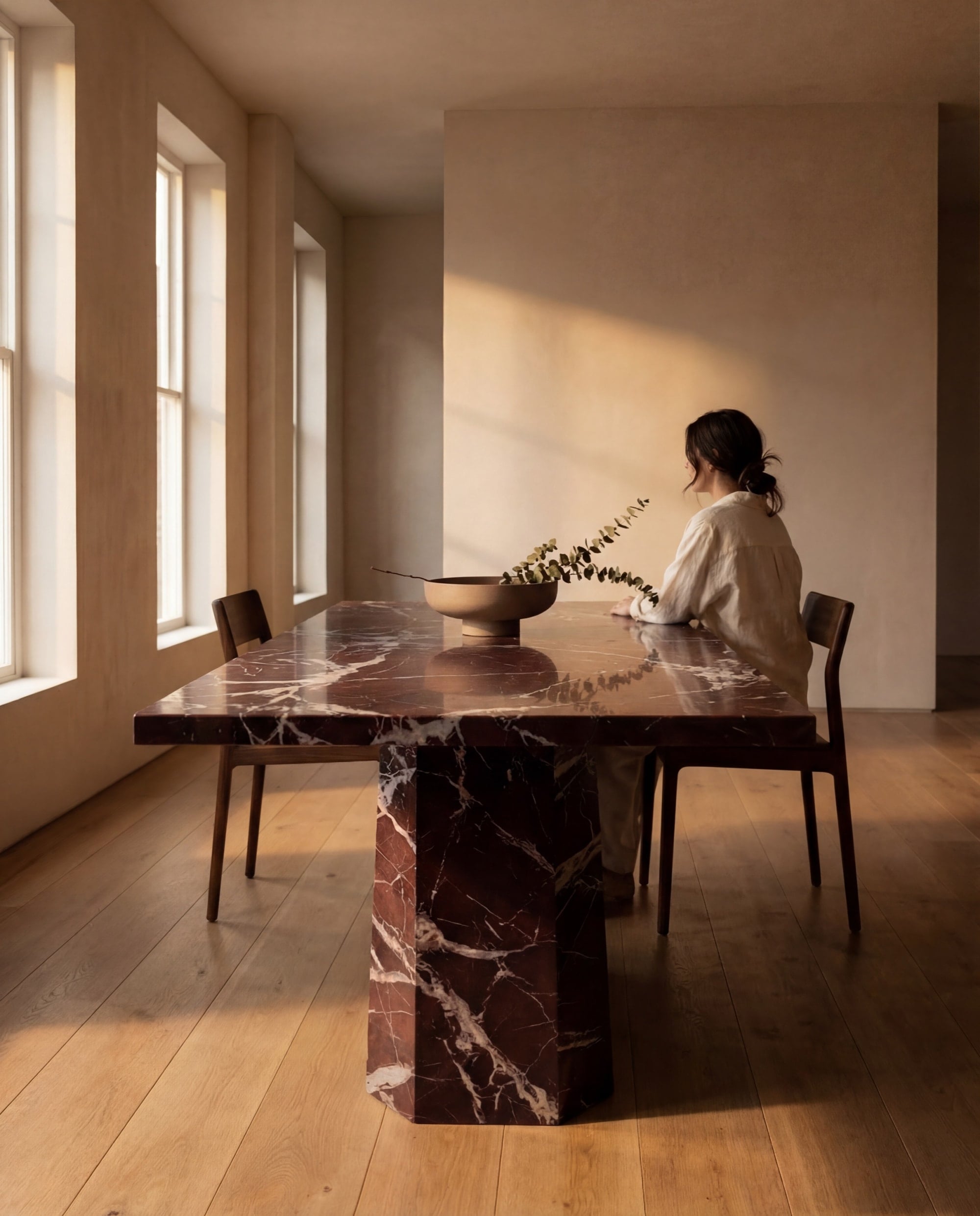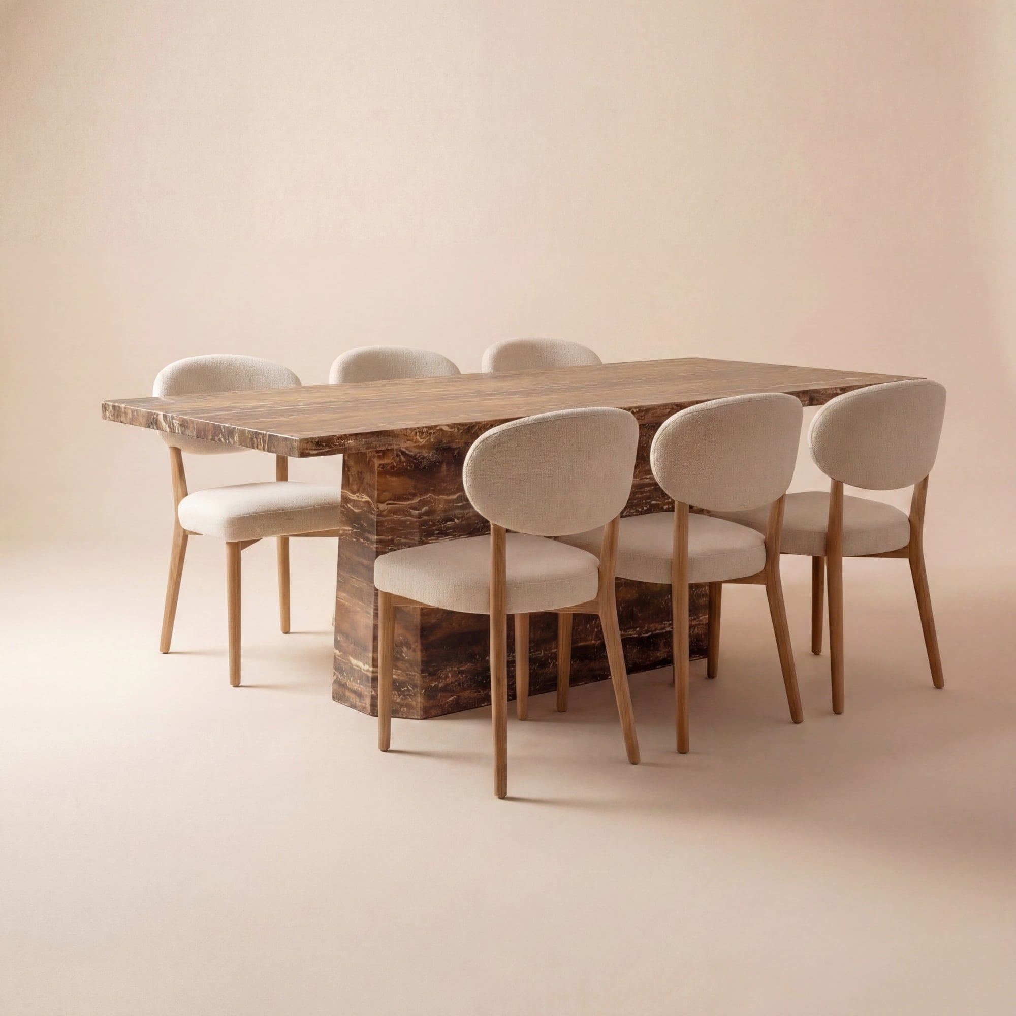 The Mensa is a table made to gather — a long, low form cut from a single slab of natural stone. Its clean rectangular surface invites long meals and longer conversations; its weighted pedestals root it to the room. Each Mensa is shaped by hand in Dubai, finished to reveal the stone's own veining and tone. A piece designed to become the quiet centre of a home.
